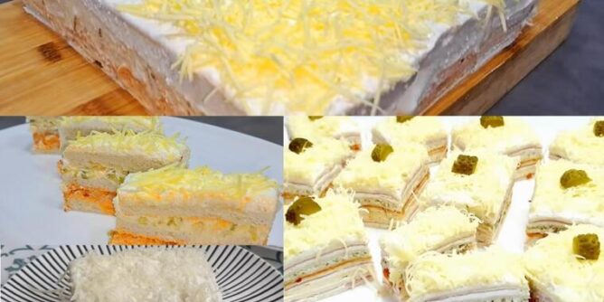 - Stavite treći sloj od 9 kriški tost hleba i premažite ga trećim filom.