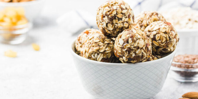 Mešajte dok se sastojci dobro ne sjedine, a smesa postane dovoljno čvrsta za formiranje kuglica. Ako je suviše suva, dodajte par kapi vode ili biljnog mleka.