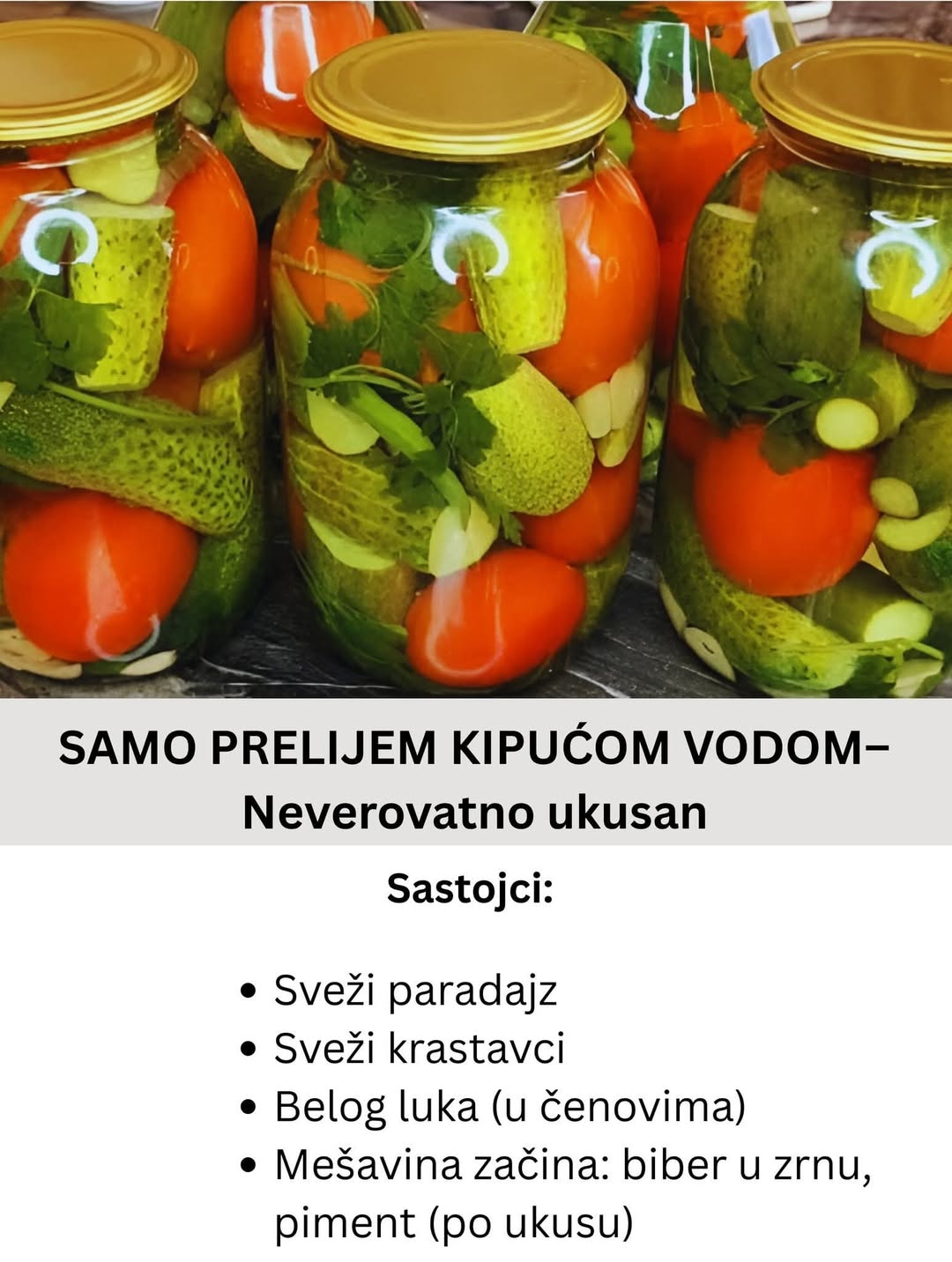 Ako tražite brz i ukusan način da sačuvate paradajz i krastavce, ovo je savršen recept! Bez komplikacija – samo prelijete kipućom vodom i uživate u rezultatima. Sastojci: Sveži paradajz Sveži krastavci Belog luka (u čenovima) […]