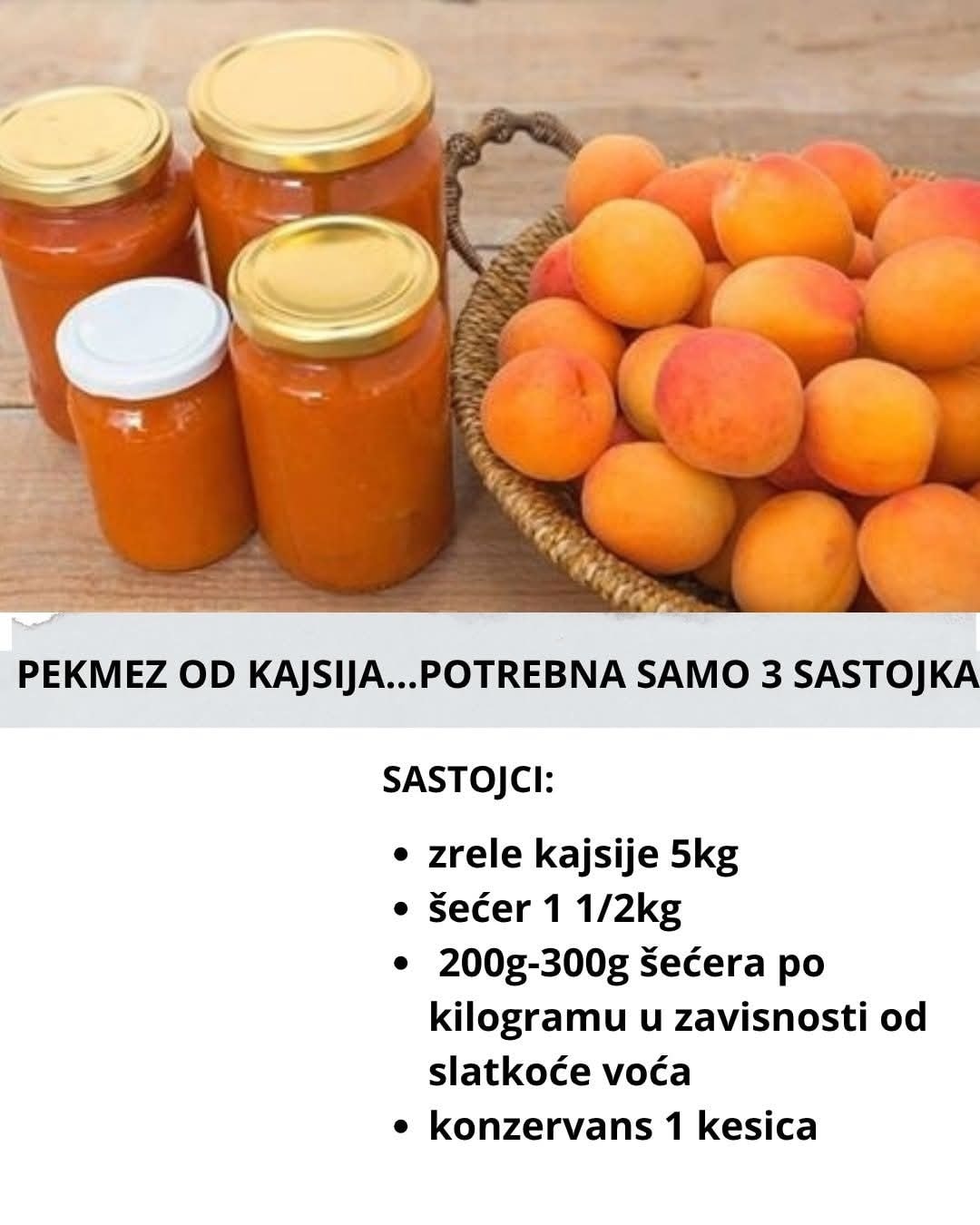 Sastojci zrele kajsije 5kg šećer 1 1/2kg – 200g-300g šećera po kilogramu u zavisnosti od slatkoće voća konzervans 1 kesica Iz kajsija izvaditi koštice, pomešati sa šećerom i rukama dobro izgnječiti. Staviti da se […]