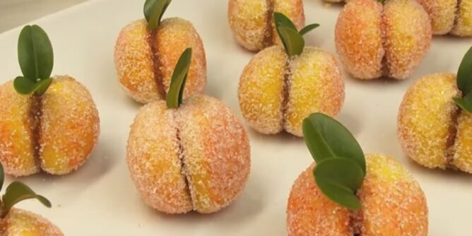 Boju za kolače razmutiti u vodi, dodati aromu kajsije, breskvice umkati prvo u žutu pa u crvenu boju i ostaviti da se boja na njima osuši. Dok su još vlažne uvaljati ih u kristal šećer.