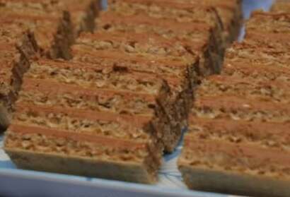 Nakon hlađenja, oštrim nožem seče se bez lomljenja i ostavlja uredne, ravne štanglice. Fil je mekan, pun čokolade i oraha, a oblande upijaju taman toliko vlage da omekšaju, ali zadrže formu.