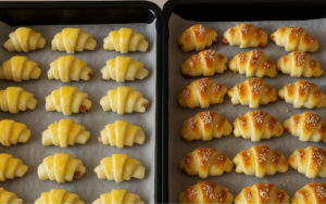 Poređajte ih na pleh obložen papirom za pečenje, premažite malo uljem ili jajem (ako pravite posnu verziju, preskočite jaje) i pospite susamom ili makom.