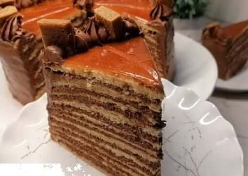 Slaganje je jednostavno: korica, tanak sloj krema, pa opet korica i tako redom dok sve ne utrošite. Gornju koru ostavite bez krema jer dolazi karamel glazura. U šerpi otopite šećer sa malo vode dok ne postane zlatan karamel i brzo prelijte preko poslednje kore, poravnajte i ostavite da se stegne. Nakon hlađenja možete je iseći na trougliće koji se tradicionalno ređaju po vrhu ili ostaviti glazuru u celosti.