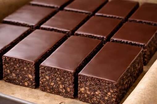 Kasato se zatim stavlja u frižider na najmanje dva do tri sata, a idealno je da odstoji i duže, kako bi se potpuno stegao. Nakon hlađenja se lako seče na kocke ili štanglice, a svaki komad zadržava lep oblik i bogatu strukturu. Na preseku se vidi kompaktna, tamna unutrašnjost, puna čokolade i keksa.