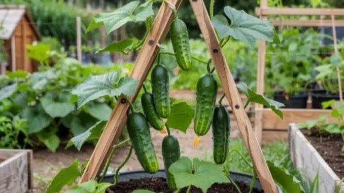 Postavite mrežu ili štap za penjanje – krastavci se vole penjati i tako štede prostor.