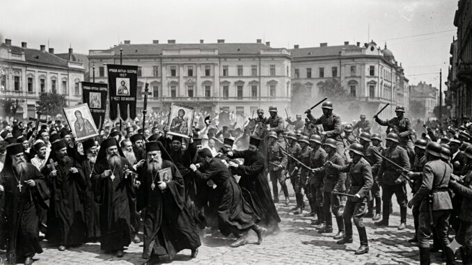 Plašeći se nemira, policija je zabranila skup, a nakon što su se sveštenici i građani ipak okupili i krenuli ka Hramu, reagovala je nasiljem. Ništa slično Beograd ni pre ni posle nije video! U ulici Kralja Petra, kod zgrade Narodne banke, gde je “okršaj” bio najžešći, žandari su brutalno tukli, kako narod, tako i sveštenike i monahe, a povređene su bile i neke vladike.